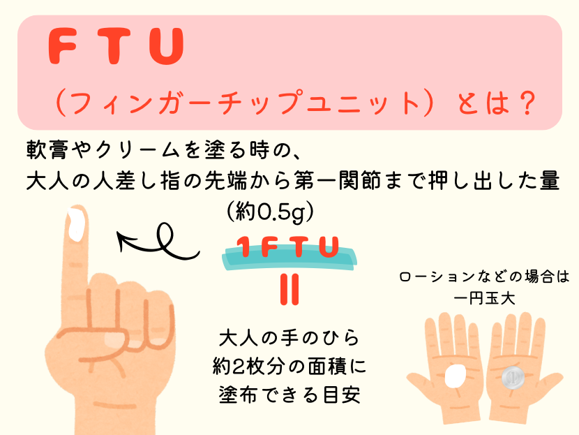適切な量としては「FTU(フィンガーチップユニット)」が目安になります。これは、大人の人差し指の先端から第一関節までチューブから絞り出した量で、約0.5gに相当し、この量で大人の手のひら2枚分程度の面積を保湿できます。全身に使用する場合、成人では1回あたり約20gが目安です。ローションタイプの場合は、1円玉程度の量が1FTUに該当します。肌に塗布した後の状態が「肌にかすかに光沢があり」「ティッシュを押し当てても取れない」ようなら、適切な量を使用できているといえます。
