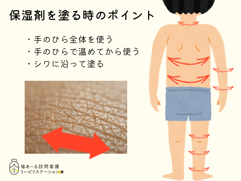 福あーるのインスタグラムでは保湿剤の塗り方について看護師が解説しています。